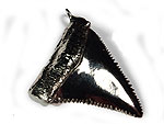 Carcharocles(Otodus) megalodon AGASSIZ 1835. Haizahn vom "Weißen Hai", gegossen in Edelstahl. VORSICHT!!! Die gesägten Schneidekanten des Zahnes sind messerscharf! Maximal-Abmessung 5,8 cm. € 68.- |