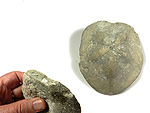 Scutella faujasi (DEFRANCE, 1827). Seeigel des Sanddollar-Typs. Miozän; Serravall („Helvet“; Savignéen-Fazies). Doué-la-Fontaine, Touraine/F. Zwei Exemplare; Durchmesser 7 und 6 cm.